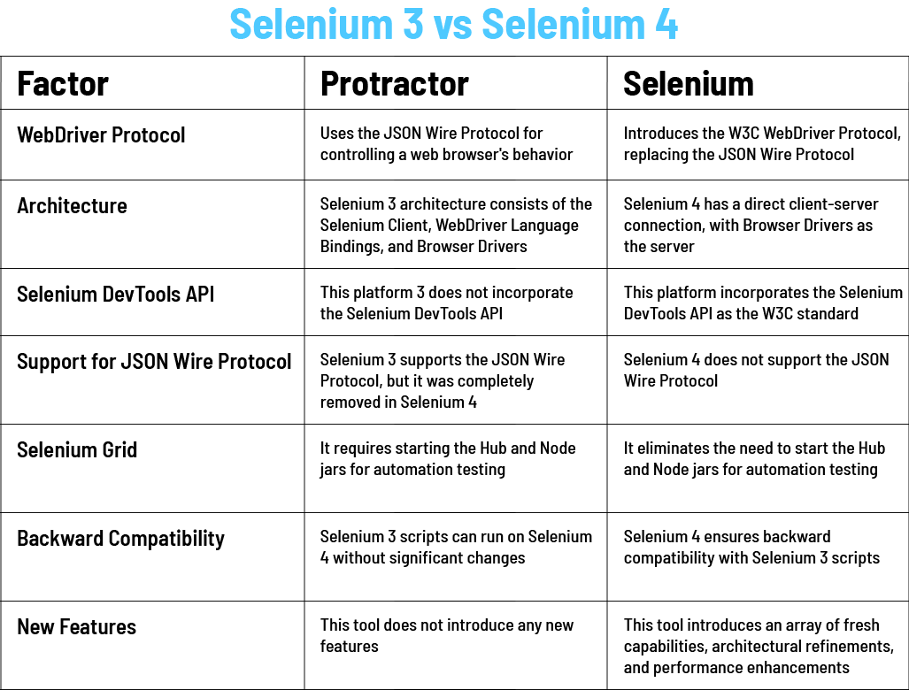 Comparing Selenium 3 vs 4, The following are the main variations between the two versions: